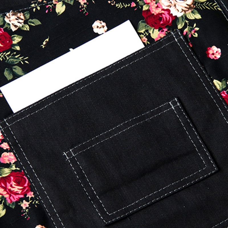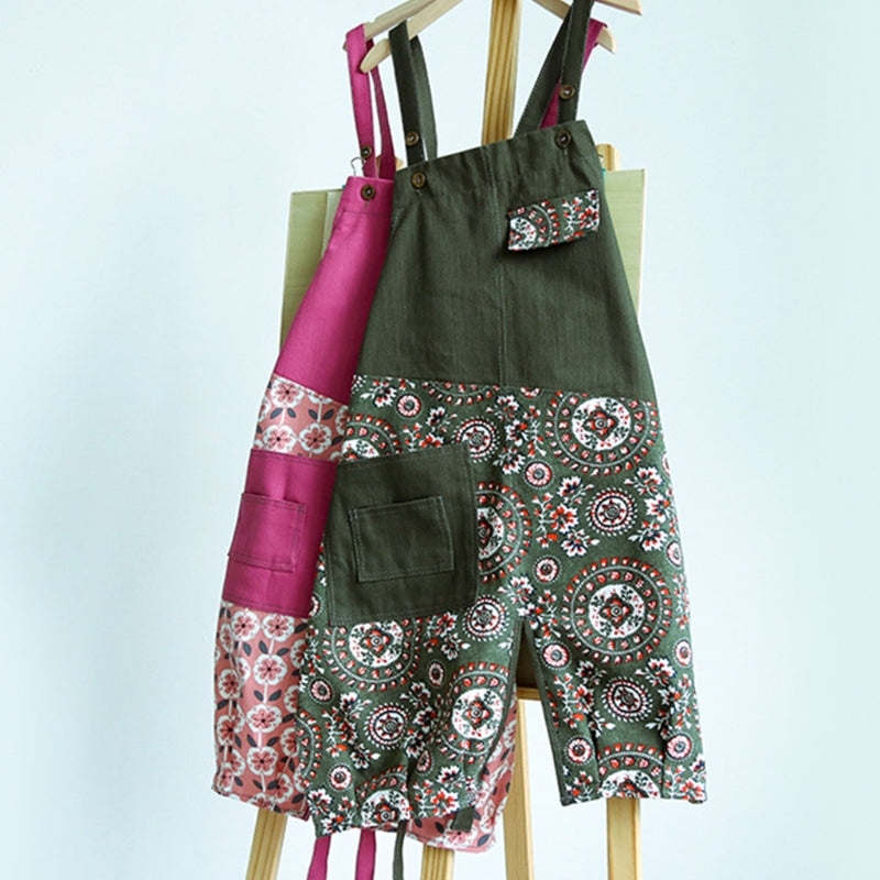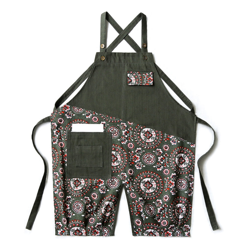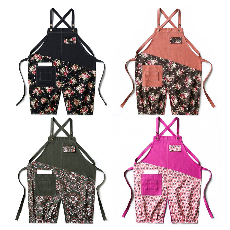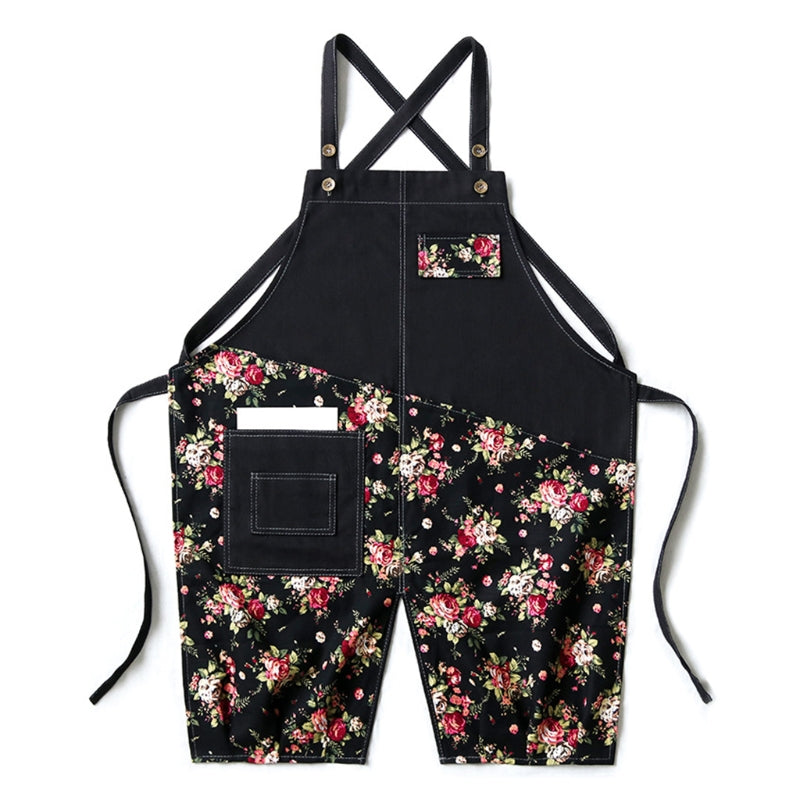 Floral Stitching Canvas Apron Cross Back Adjustable Apron Multi-pocket