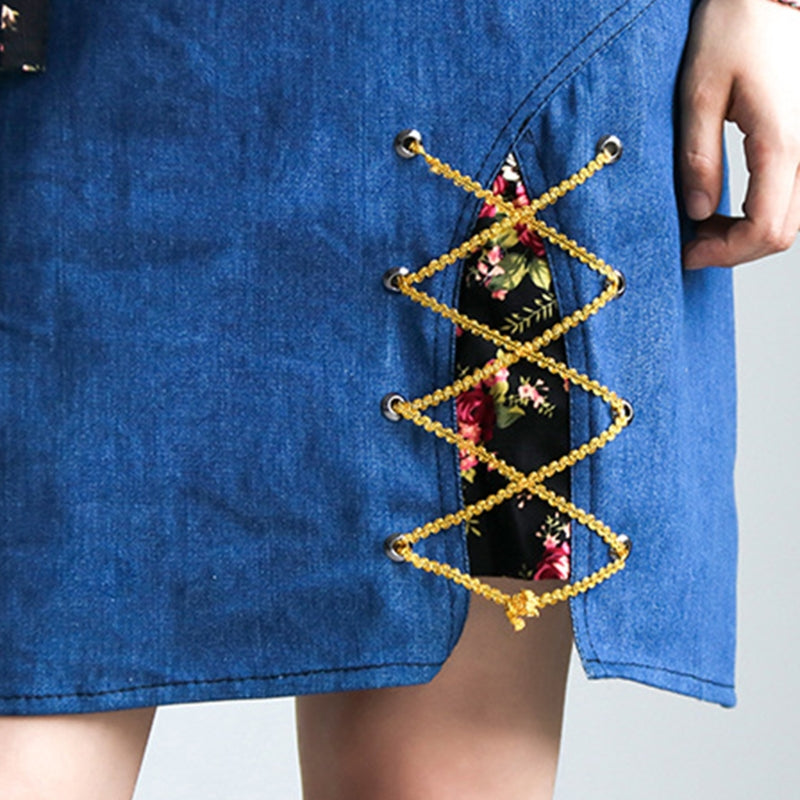 Split hem with floral patchwork, criss cross lace bandage decor, elegant and charming.