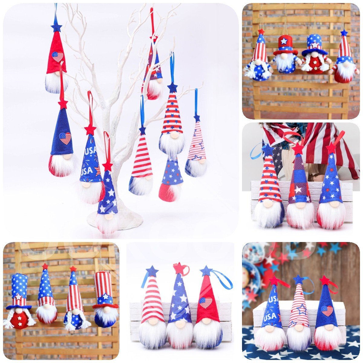 ★HANDCRAFTED- Our hanging 4th of july gnomes are made of soft felt, plush nose, fiber white beard. Gnomes are handcrafted, so different two will have some differences in size and weight. Star stripe pattern cloth is printed on the whole cloth, so it will lead to a certain difference in the pattern of each gnome.