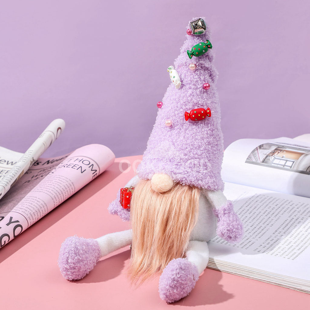 The pink gnome couple holding a mini Christmas tree and the purple gnome couple holding a mini gift box.