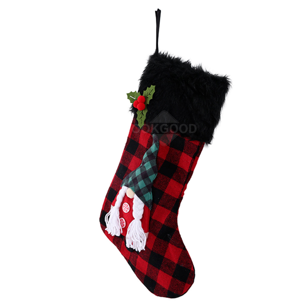This lovely Christmas stocking is made of a combination of red plaid fabric and plush gnome.
