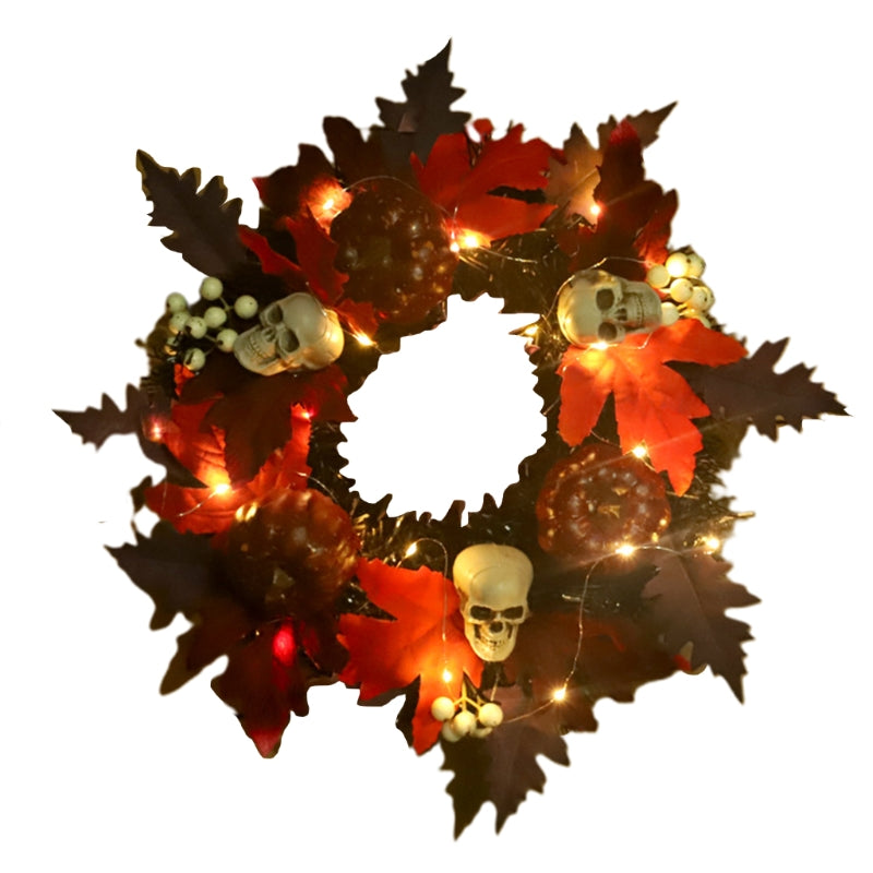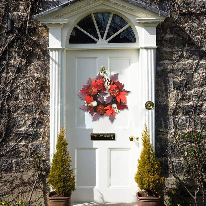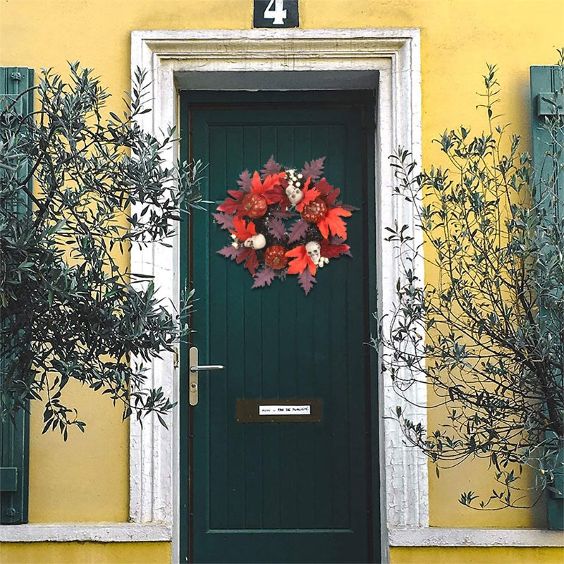 Designed with artificial pumpkins, skull, maple leaves, and red berries.