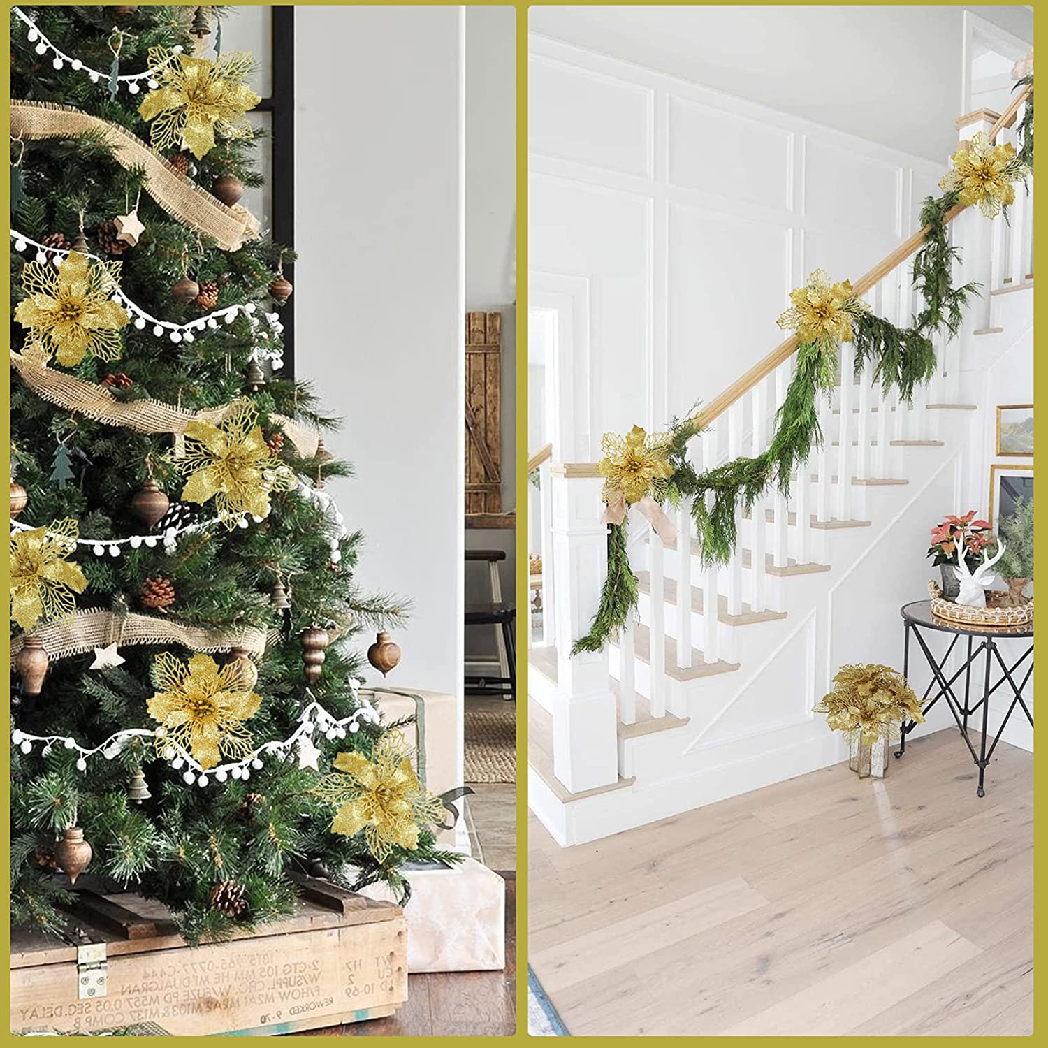 🎄Glitter Poinsettia Flowers: Each Christmas flower covered with many glitter powder. Glitter bunches of round anthers and filaments protrude from their centers. Layering pointy-tipped petals join to create elegant sparkling blooms.