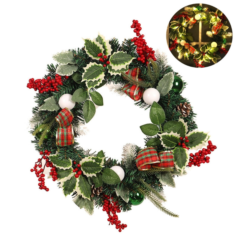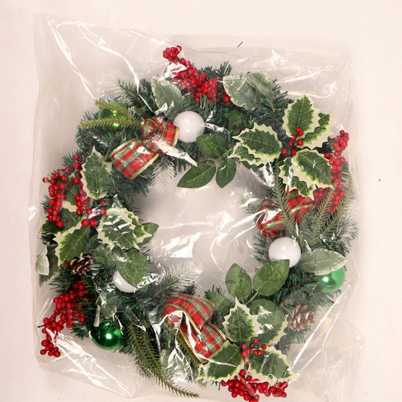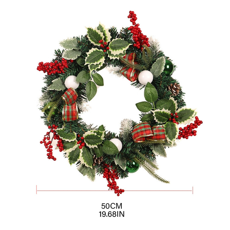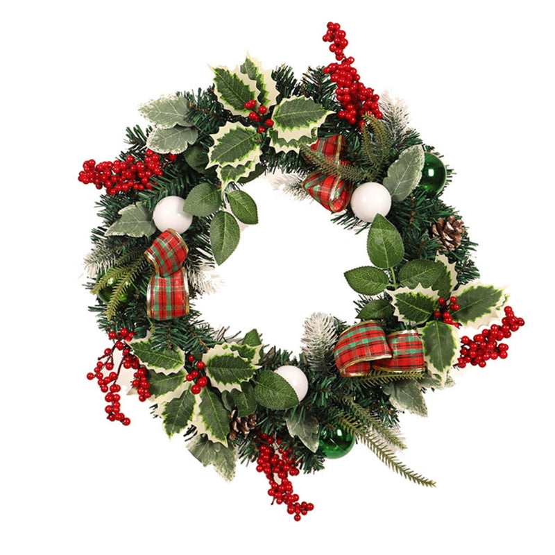 Designed with white ball, plaid ribbon bowknot, artificial red berries and faux green leaves.