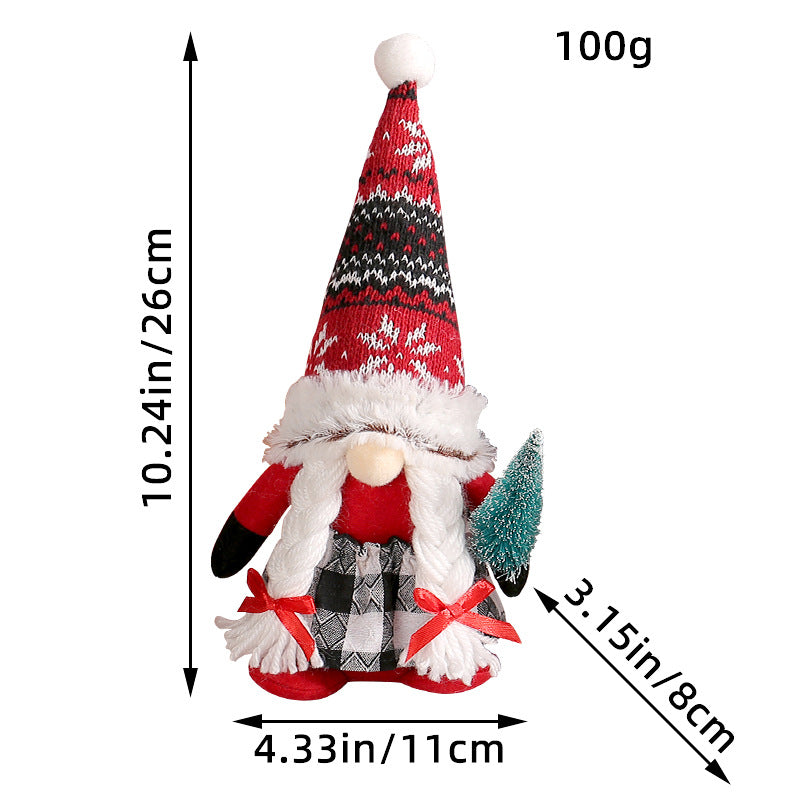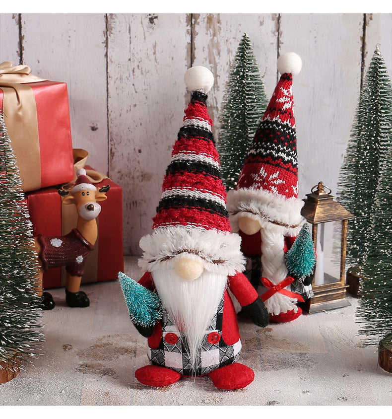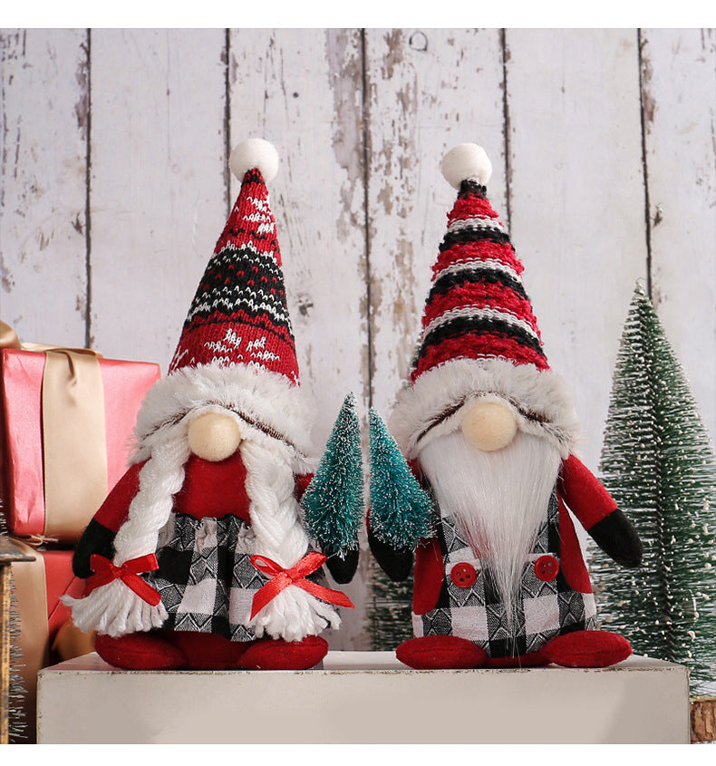 Red Christmas gnomes holding small tree