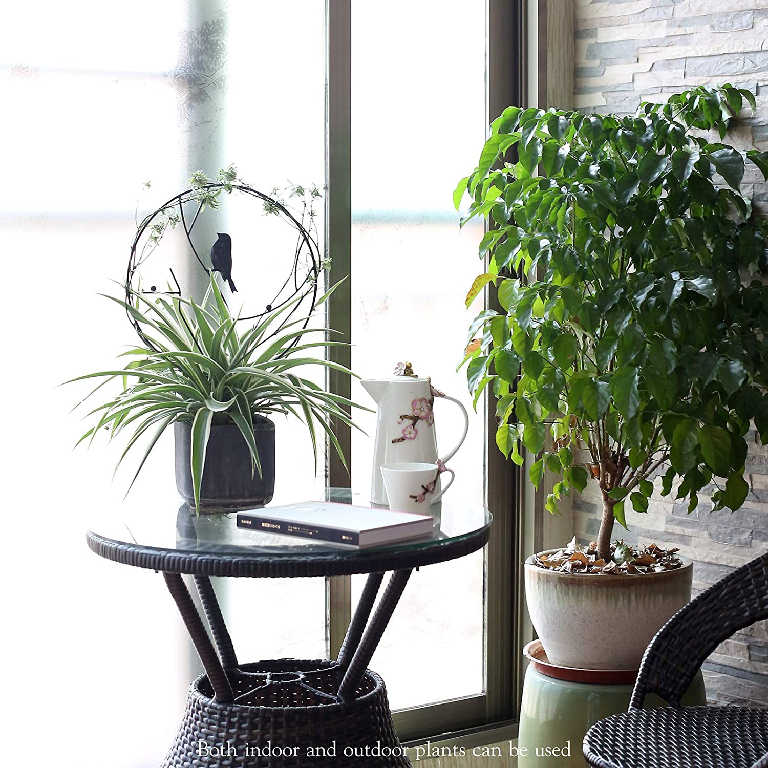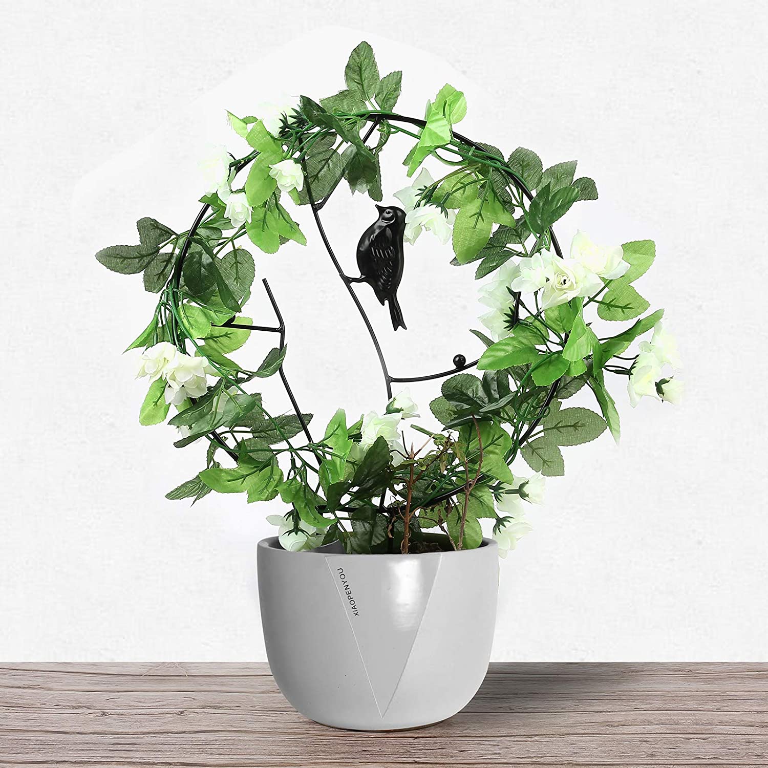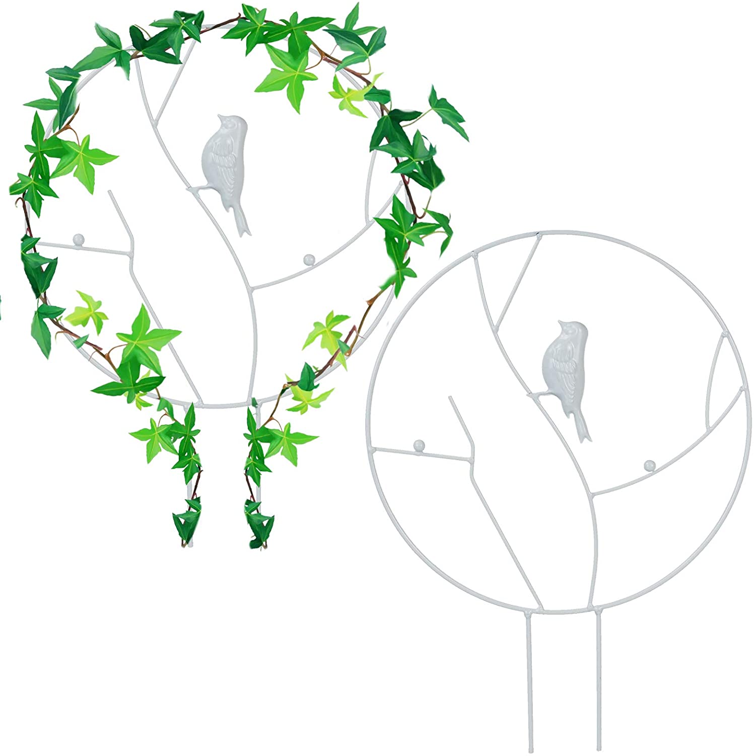 The circle frame trellis decored with branches and birds, not only to support the growth of small climbing plant, but also match your home decor.