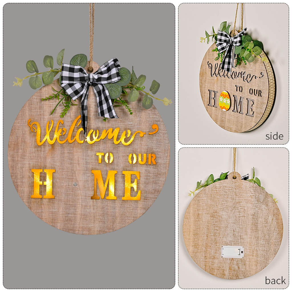 🎀PREMIUM WOODEN MATERIAL- Our HOME sign is made of thicken wood, no odor, no fade. The board is decorated with eucalyptus leaves, fern and a cute linen bowknot. It is capable of emitting warm light and is powered by 2 AA batteries (Not include).