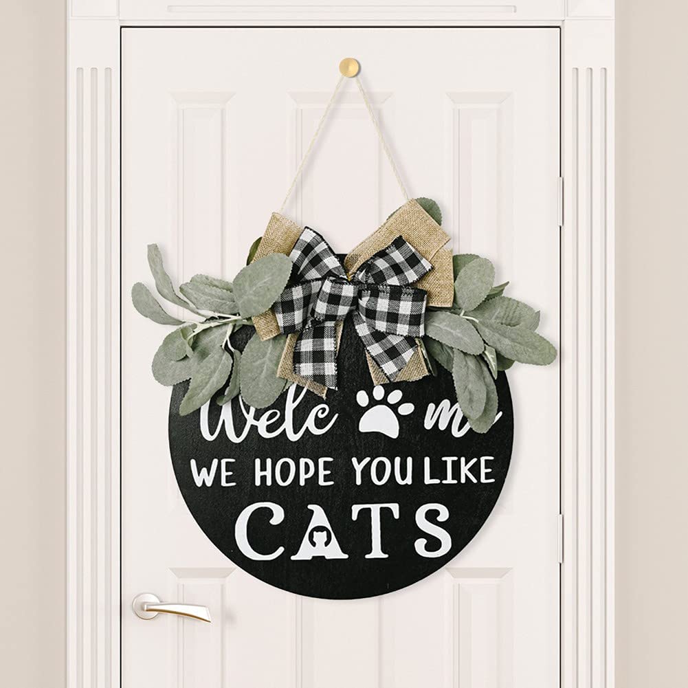 🌼Unique design- Sign Front Porch Door Decor Engraved with the -Welcome- logo. There is a cute footprint on the logo, and it says -We hope you like dogs/cats-which Makes this front door logo look cute and great!