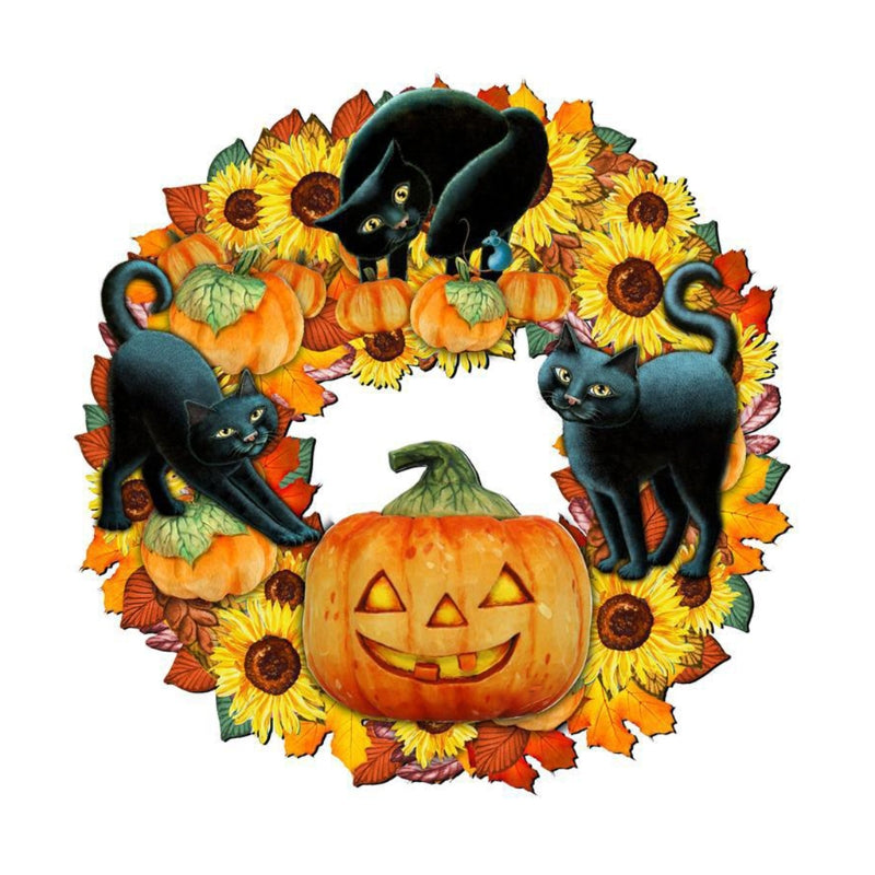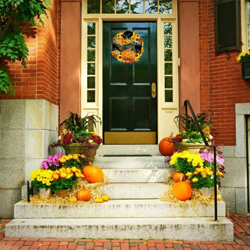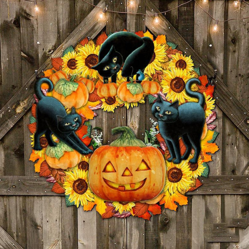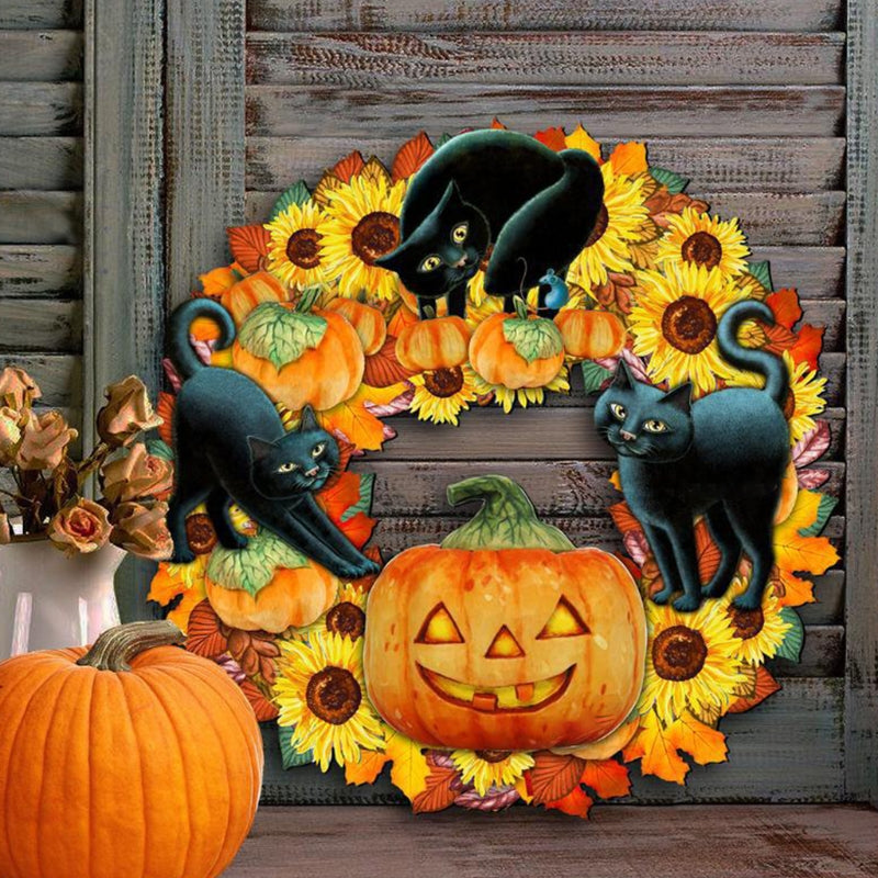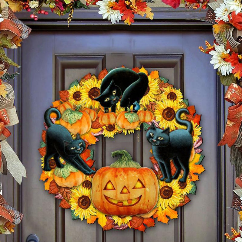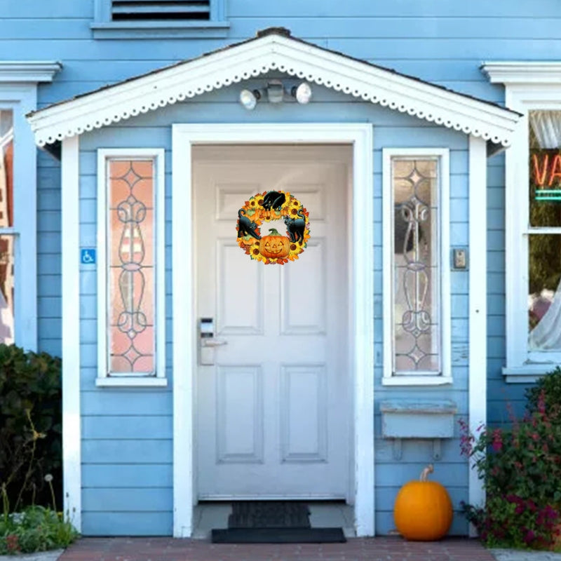 Wood Black Cat Sunflower Pumpkin Wreath For Front Door Halloween Decoration