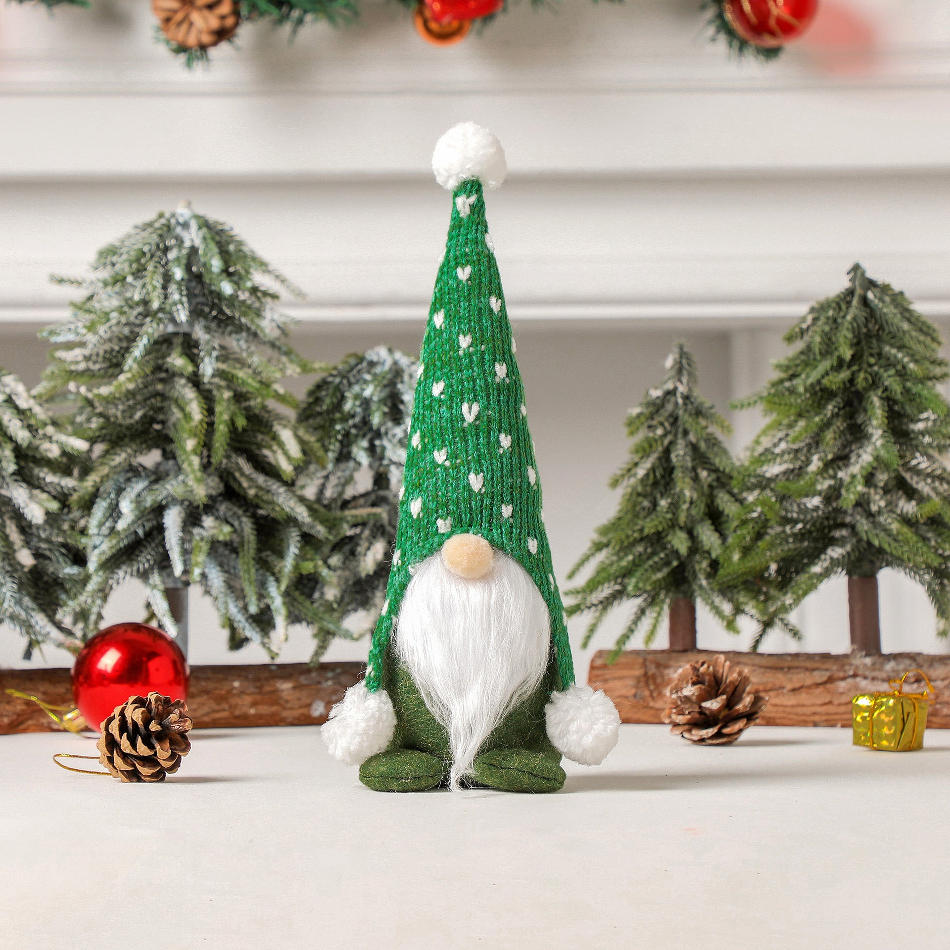 Dark green knitted Christmas gnomes with lighting nose