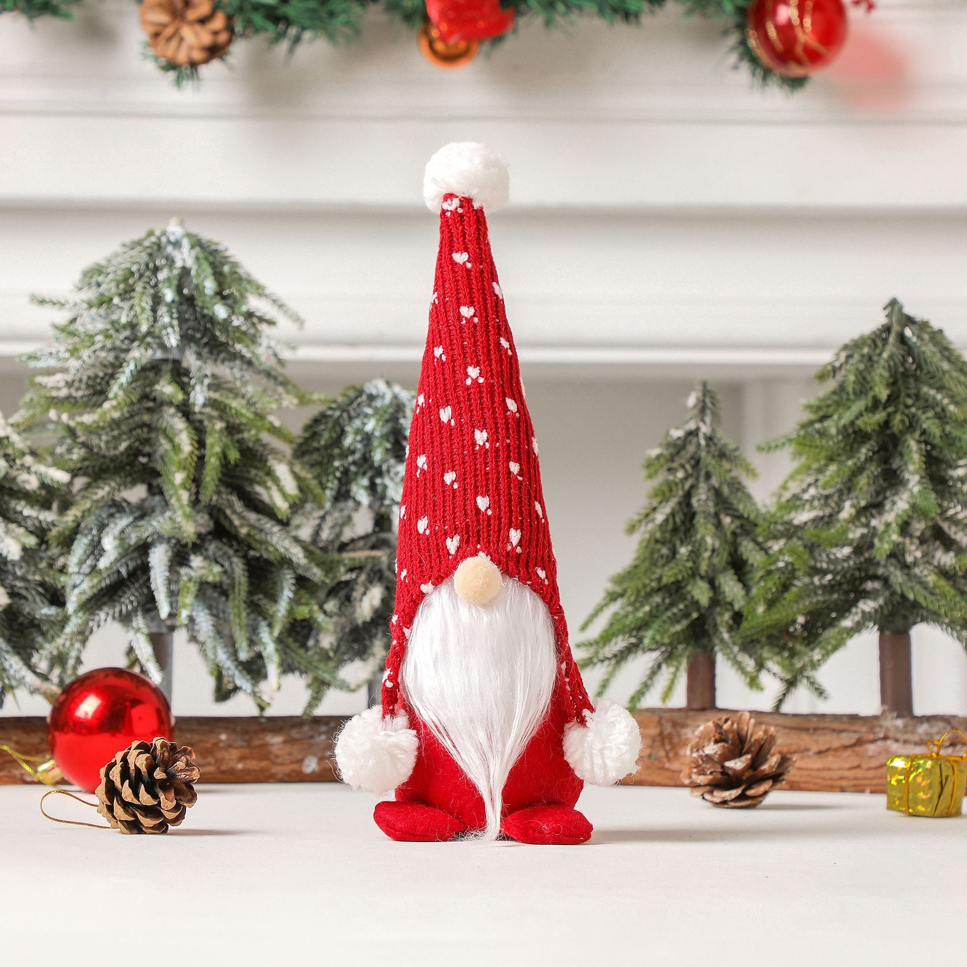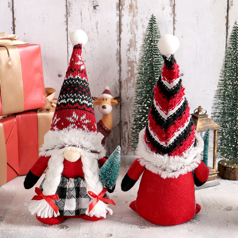 Red Christmas gnomes holding small tree