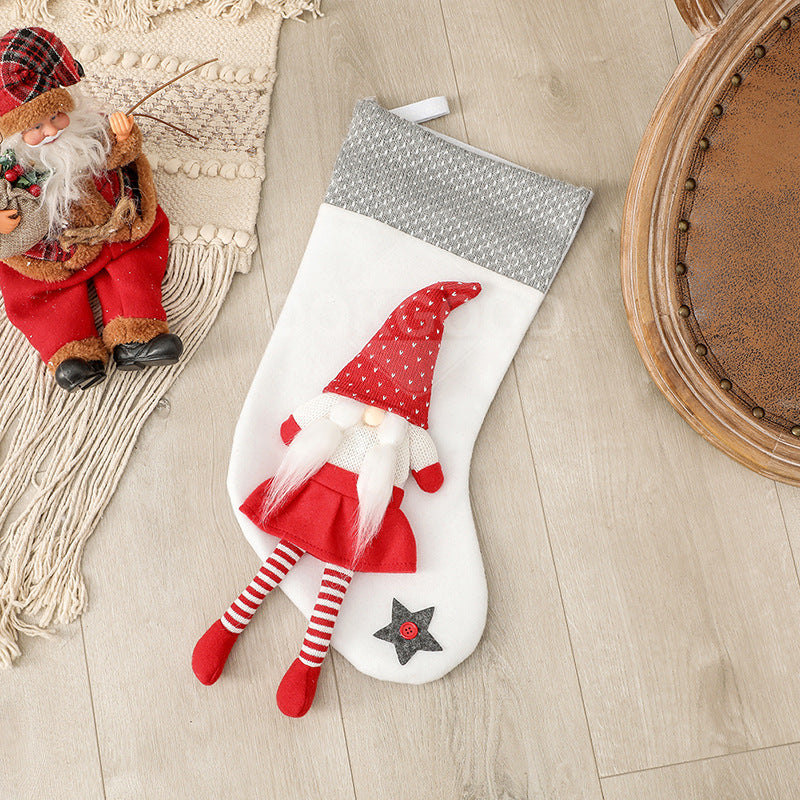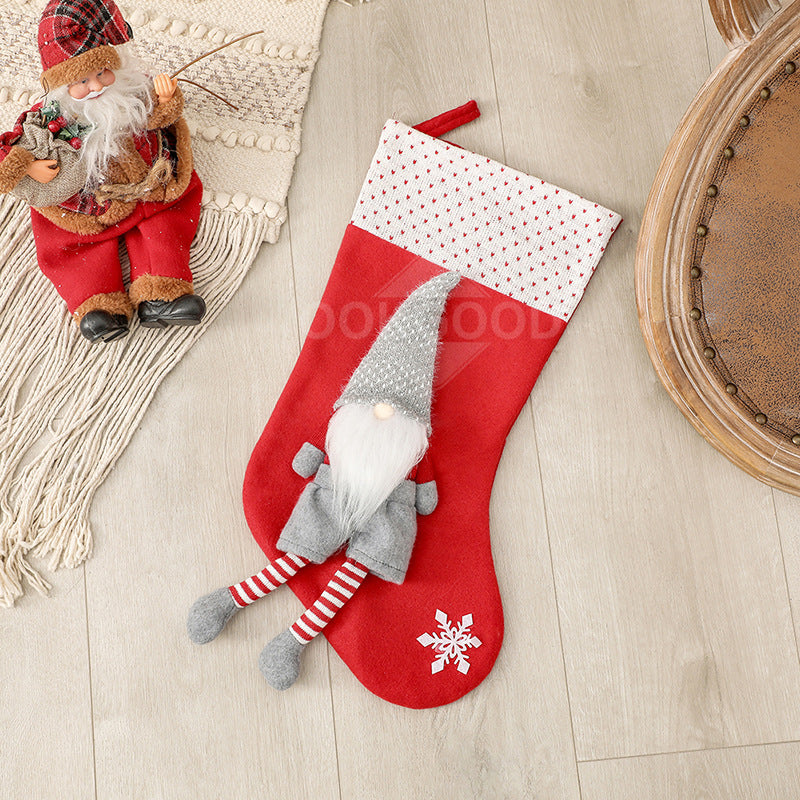 The long-legged gnome elf clings to the Christmas stocking and guards your Christmas presents.